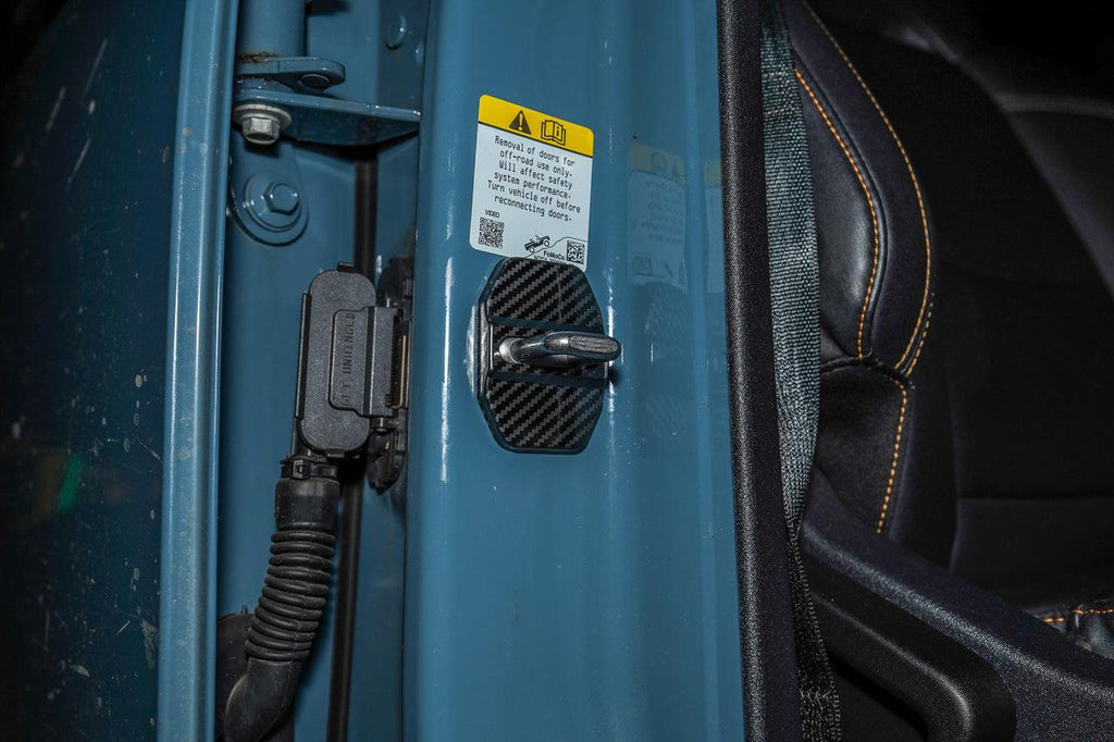 For those that value the little add-ons, here is one that covers the door strikers on your Ford Bronco. Going doors off? Cover up a little bit of exposed steel with a little more metal. However this, metal has a nice carbon fiber design.